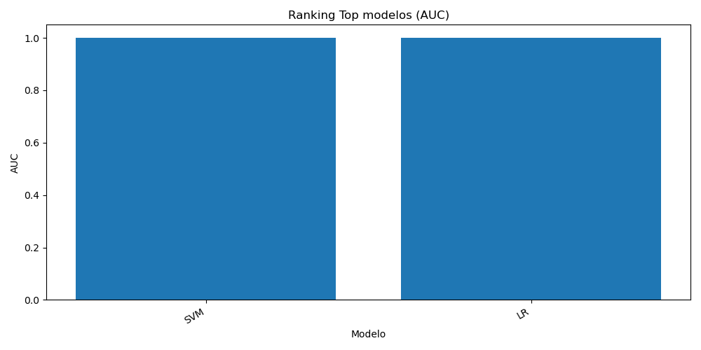 Comparativa entre SVM, regresión logística y Random Forest mediante recall, precision, F1, AUC y balanced accuracy.